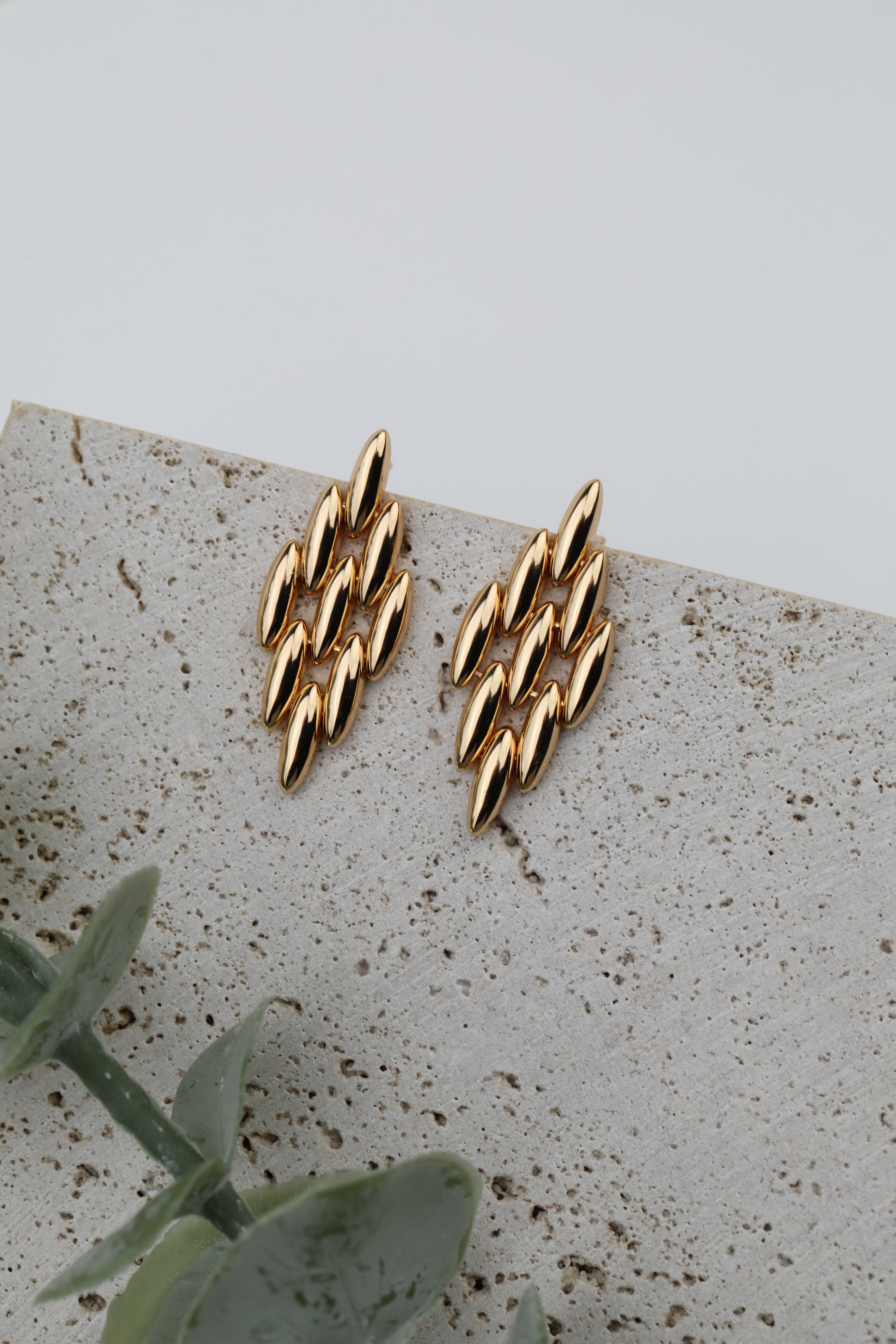 ニットデザインが特徴的なこのスタッドピアスは、立体感ときらきらした輝きが魅力です。菱形のフォルムが洗練された印象を与え、日常のコーディネートにさりげなく個性をプラスします。K18ゴールドコーティングが高級感を演出し、大人の女性にぴったりなアイテムです。