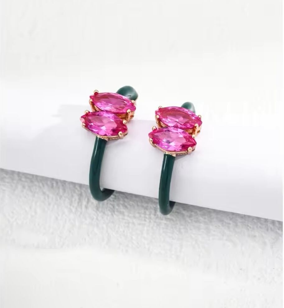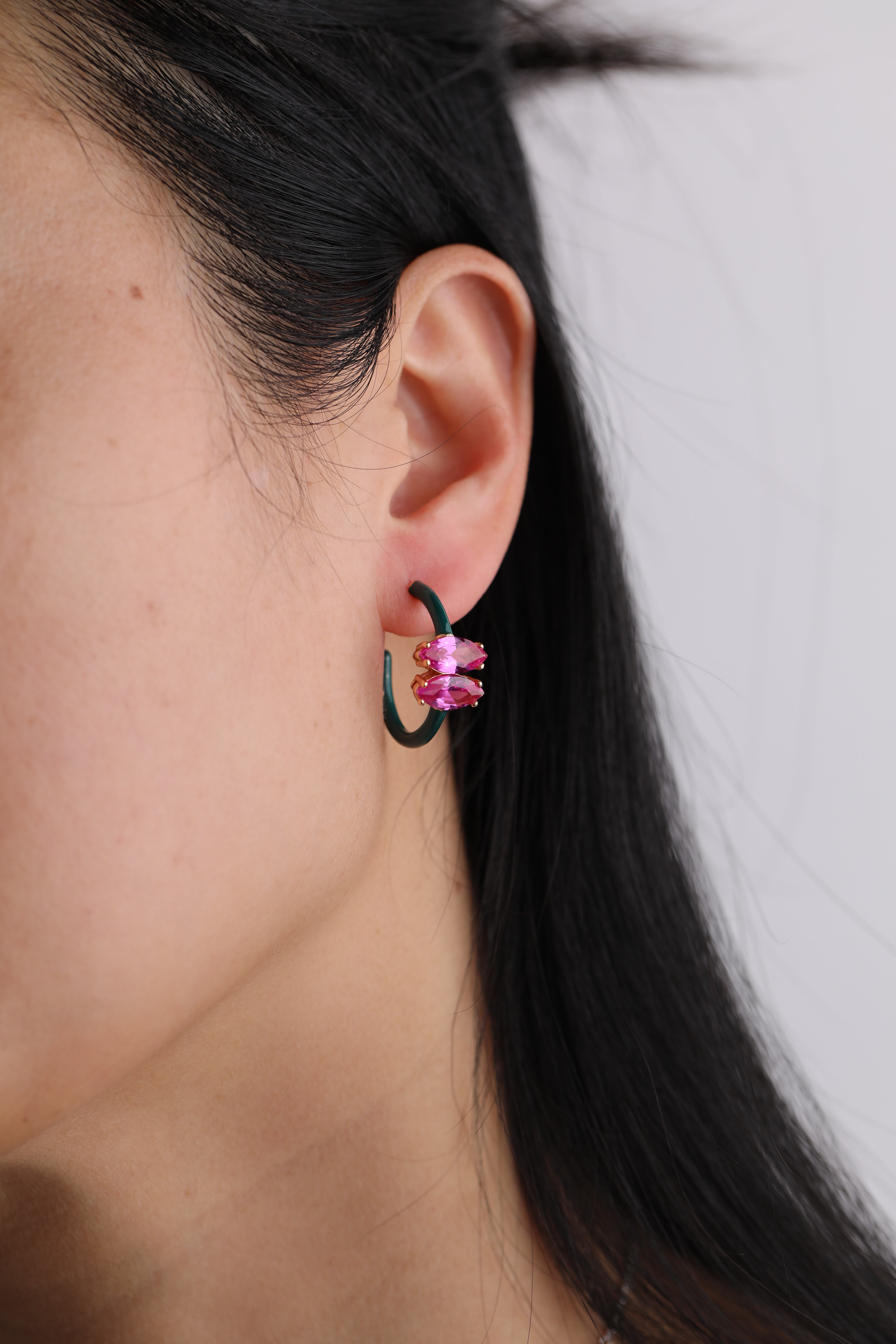 ダークグリーンとピンクの組み合わせが可愛らしく、カジュアルからフォーマルまで幅広いシーンで活躍します。フープピアスならではの存在感が、あなたのコーディネートを一層引き立てます。