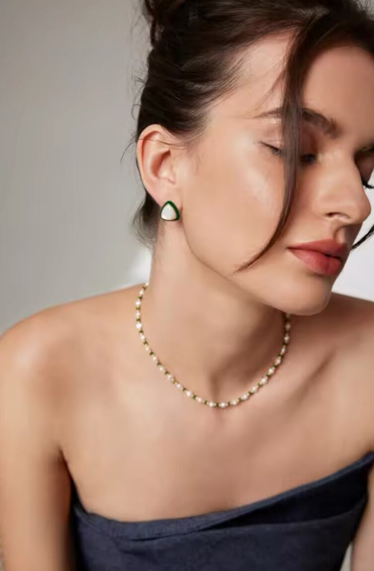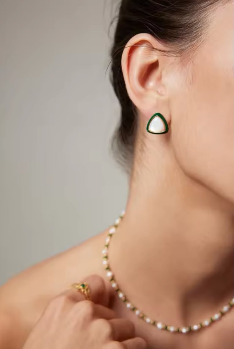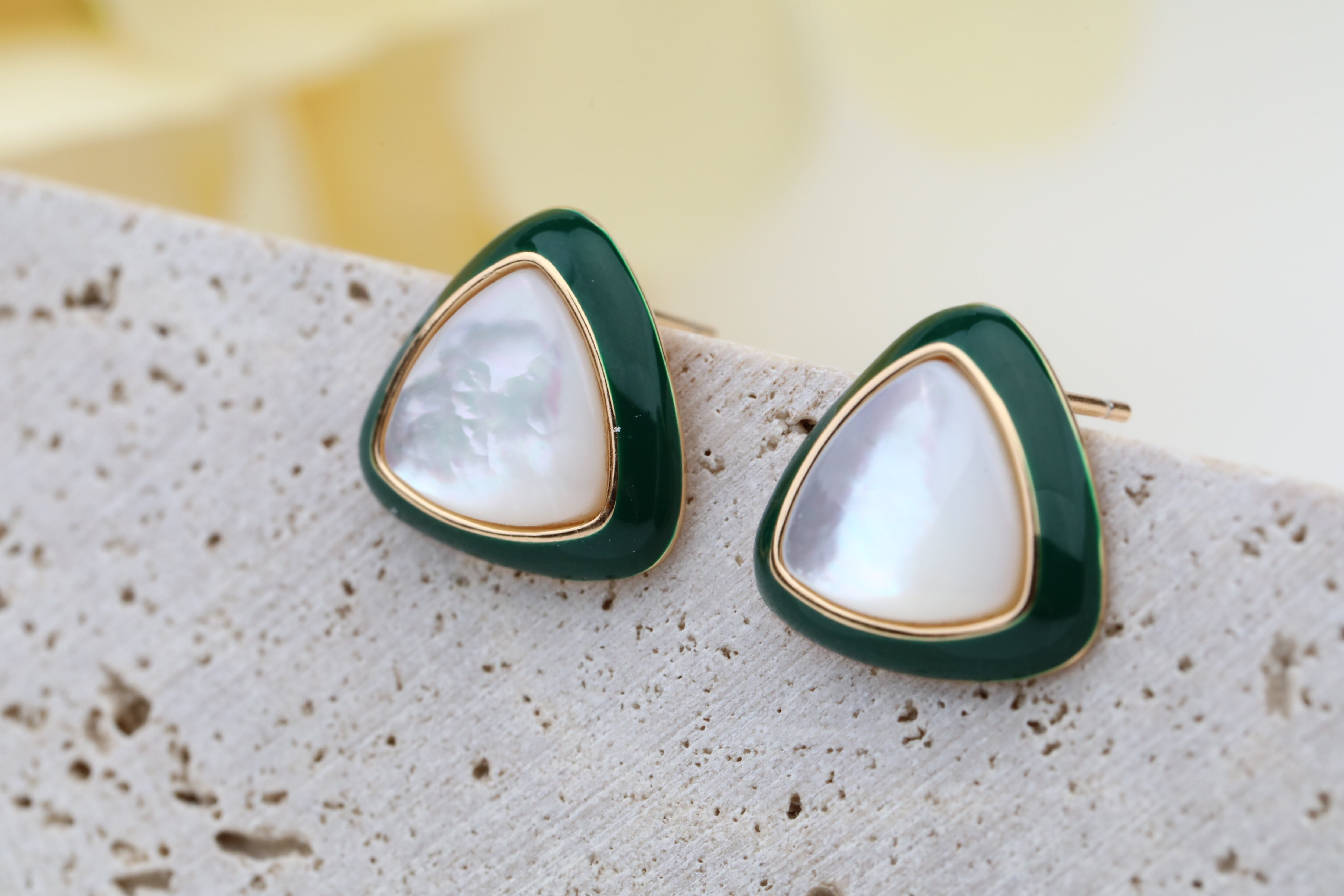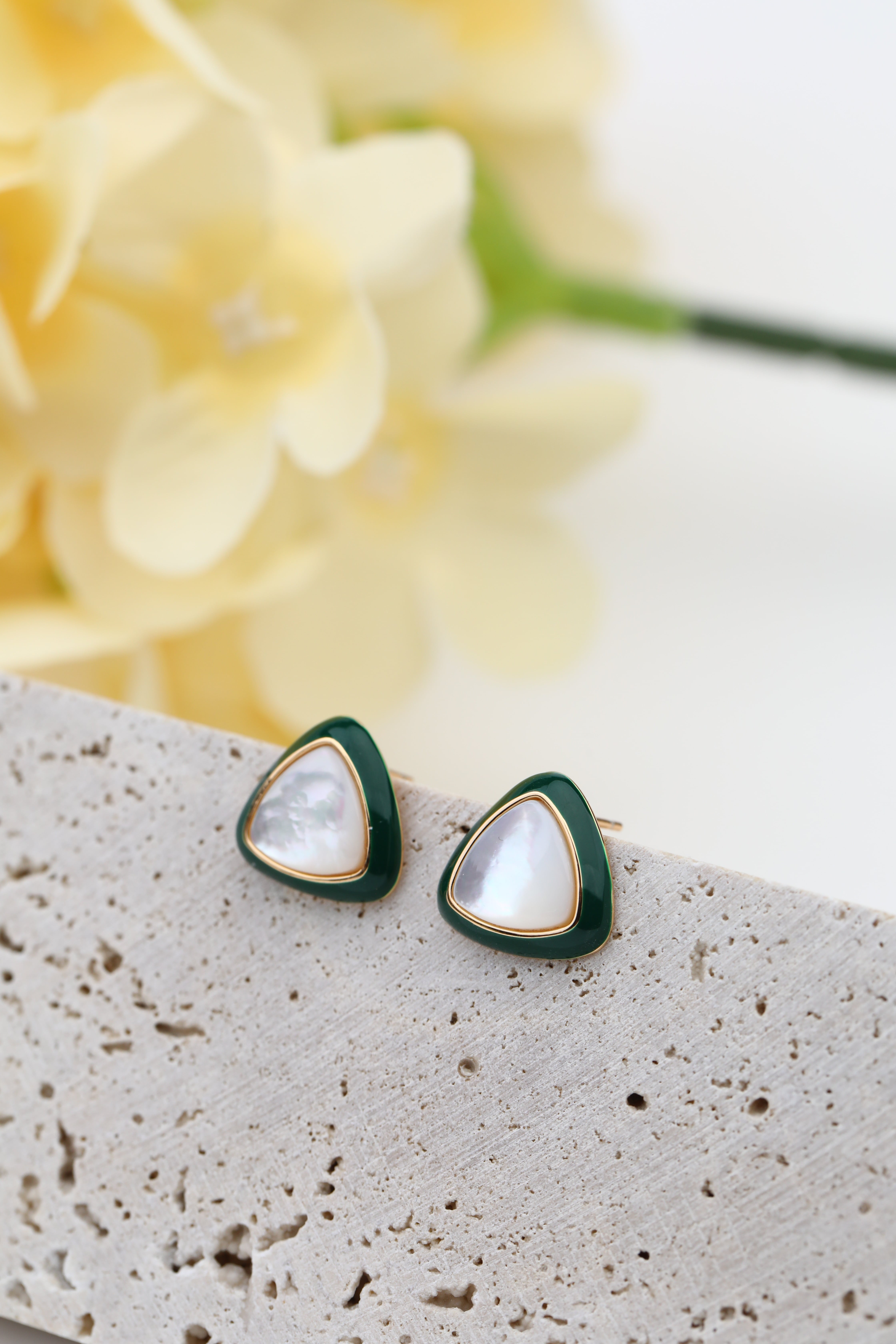 トライアングルマザーオブパールスタッドピアスは、モスグリーンのエナメルと上品な輝きを放つマザーオブパールの組み合わせが特徴のエレガントなアイテムです。