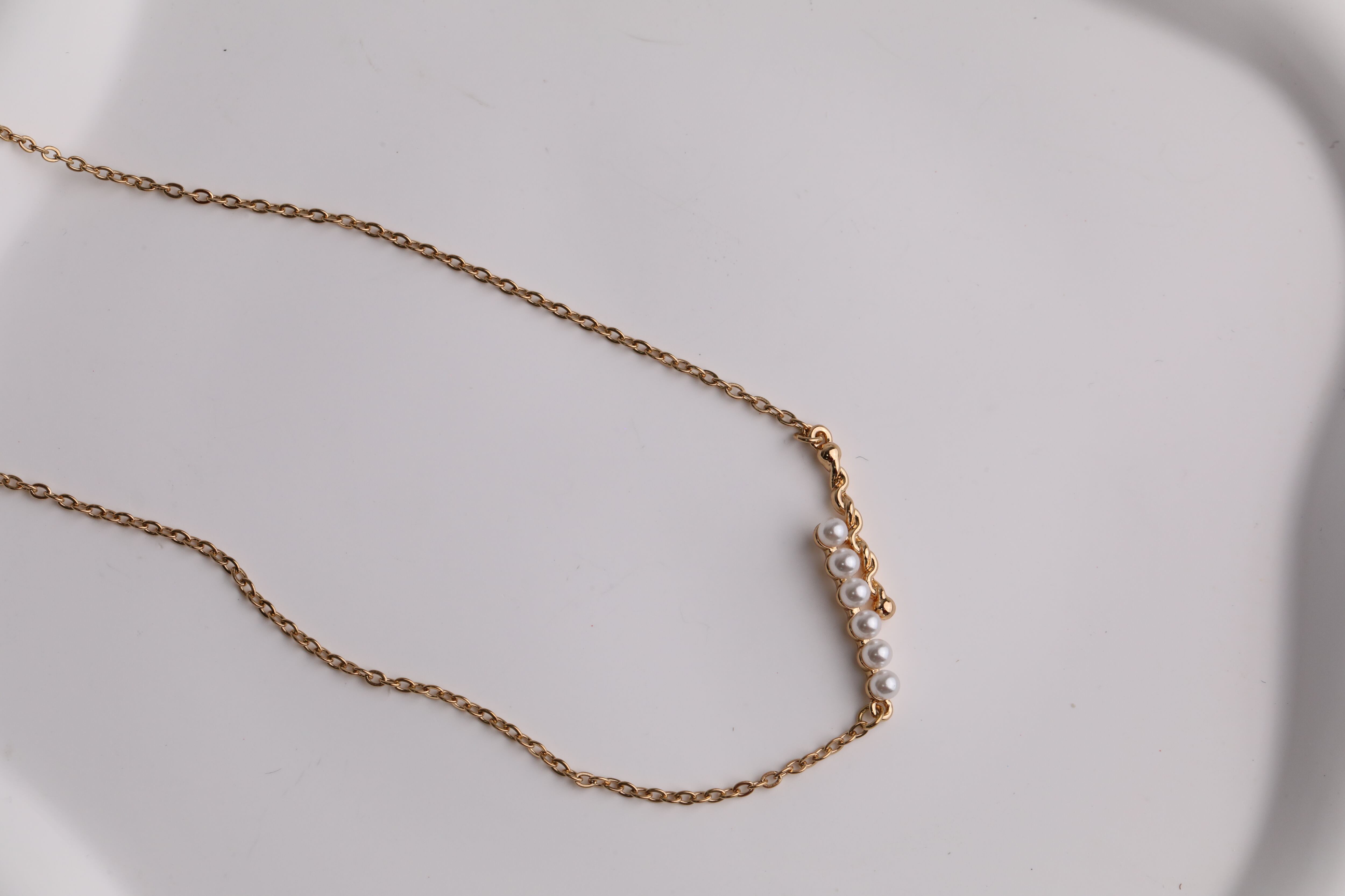イミテーションパールパールピンクゴールドネックレスは、シンプルでありながらどこか個性的な魅力を持つアイテムです。
