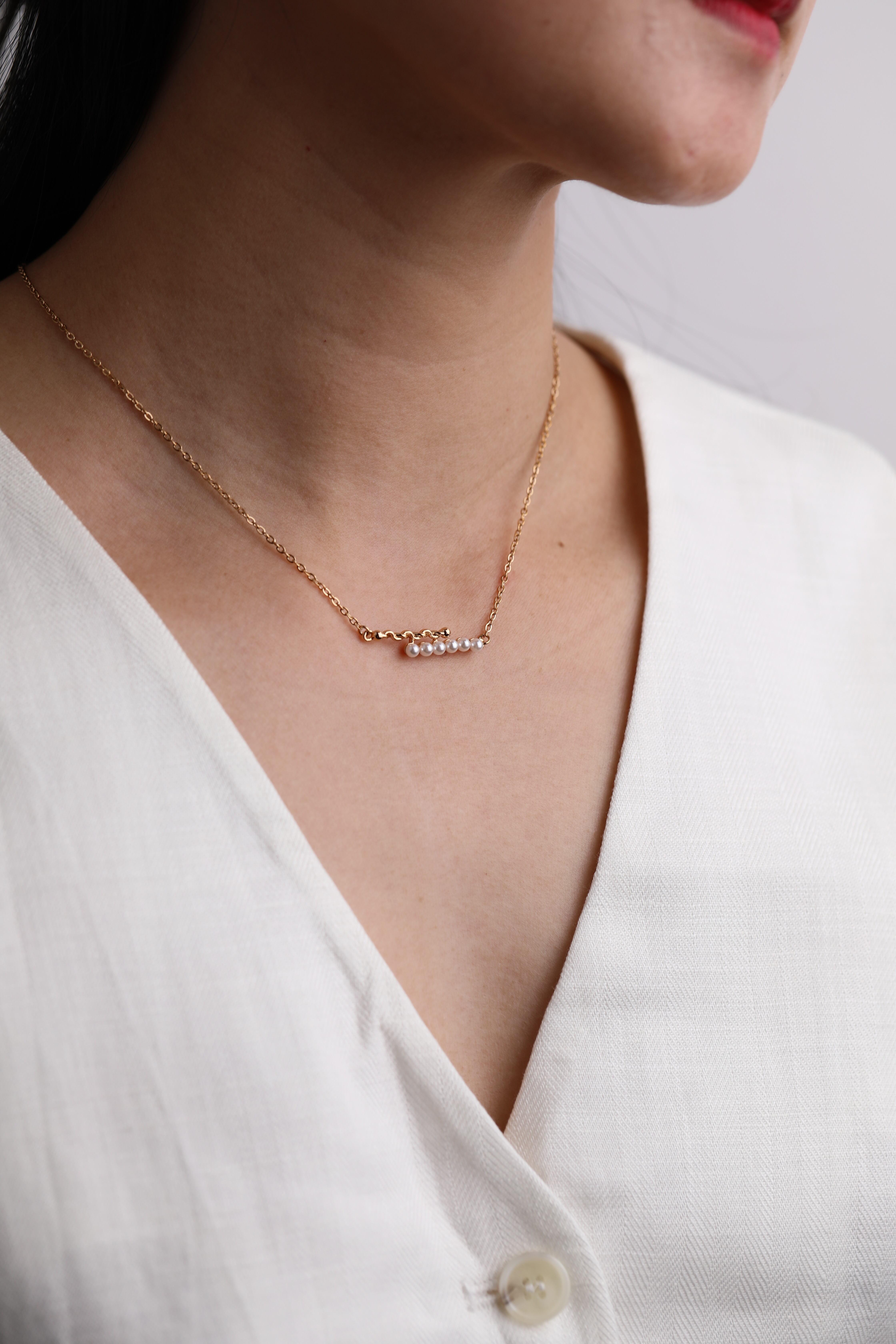 上品なピンクゴールドの輝きが、連なるパールの美しさと絶妙に調和し、あらゆるコーディネートにマッチします。