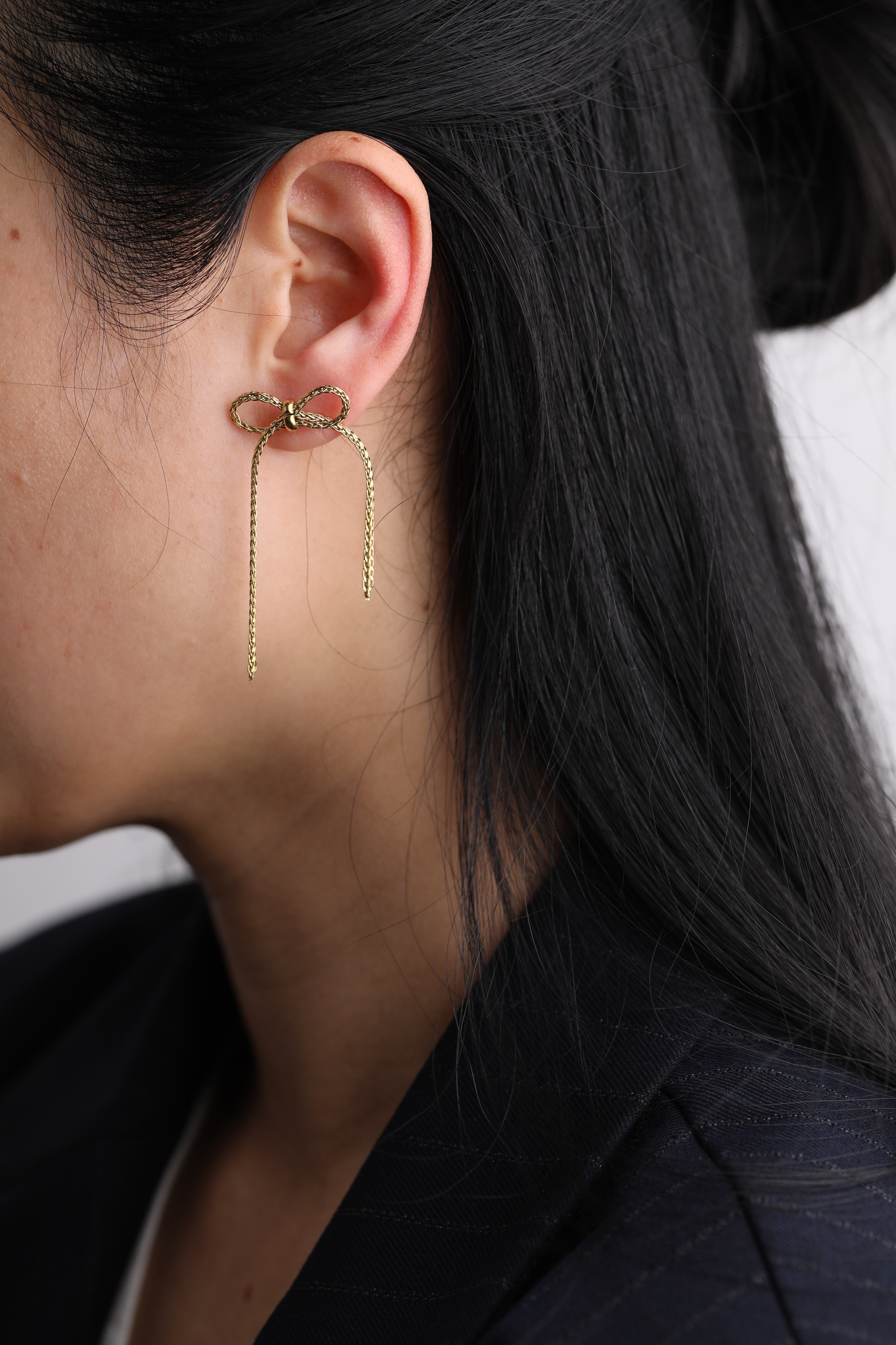 今季人気のリボンモチーフが、メタリックな輝きと共に耳元を華やかに演出します。