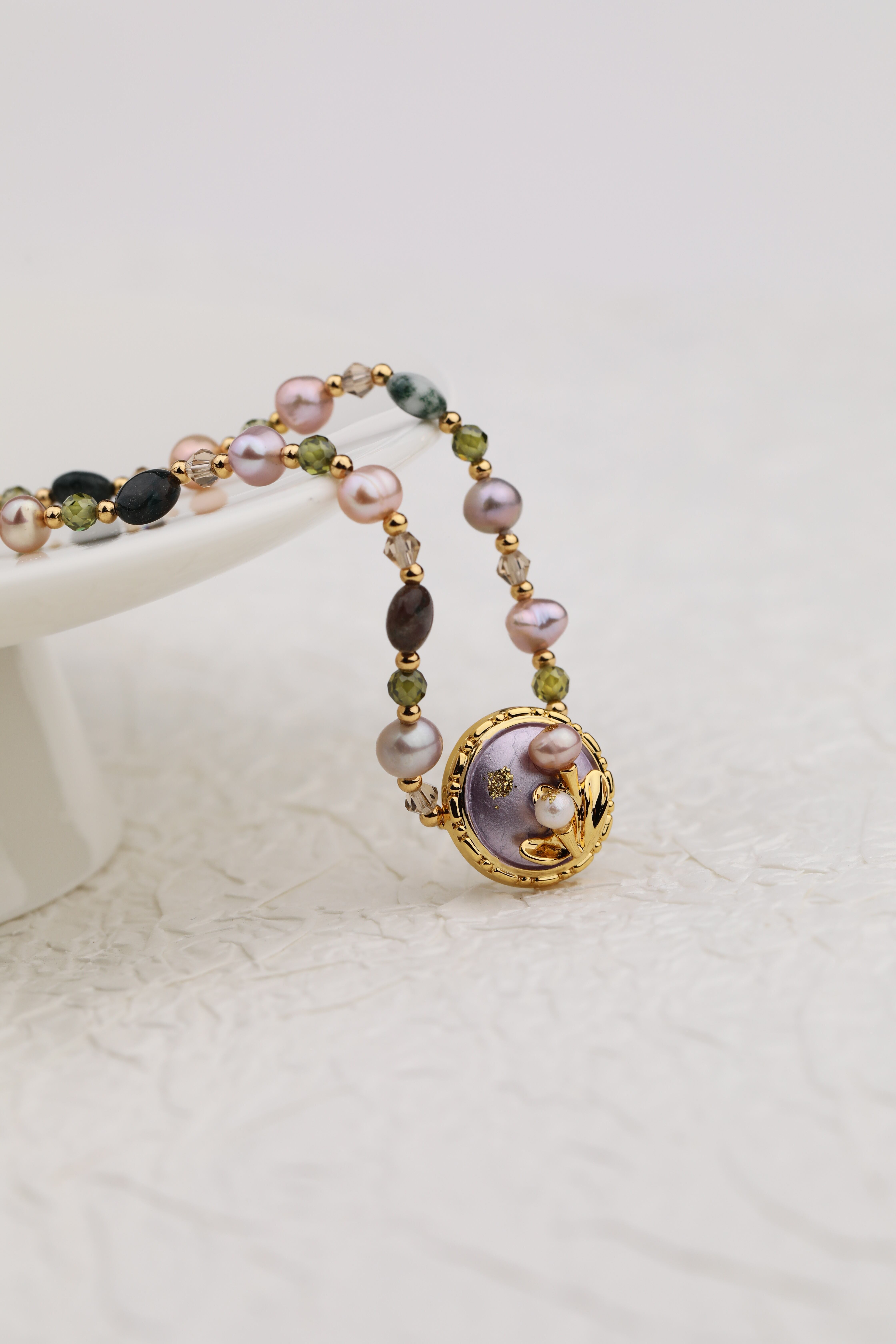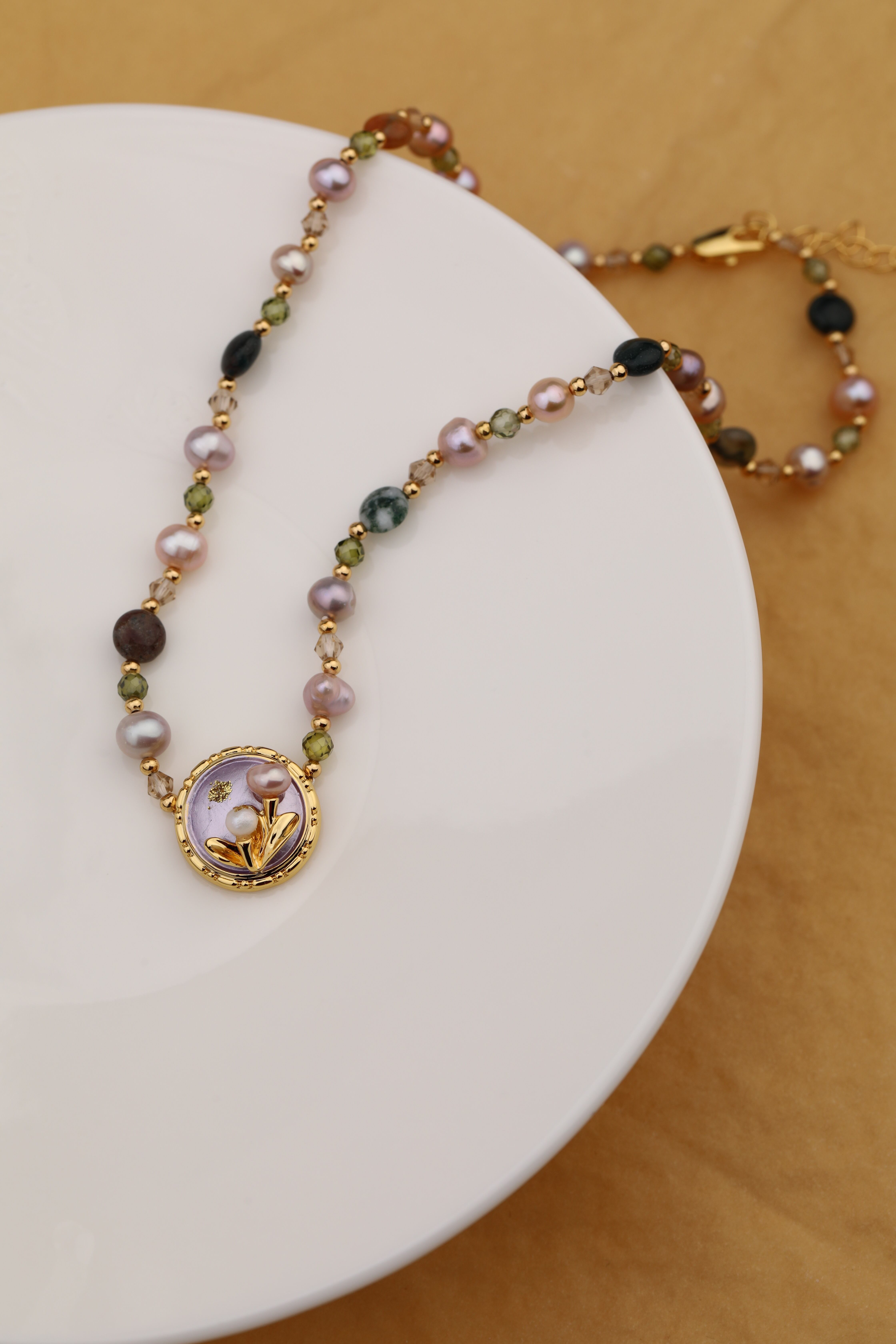 ビジューが素敵なこのネックレスは、天然石と淡水パールのビジューが華やかに彩る洗練された短めネックレスです。淡いカラーリングが美しく、特別な日からカジュアルなスタイルまで幅広くご活用いただけます。肌に優しい素材を使用しており、安心してお使いいただける点も魅力です!
