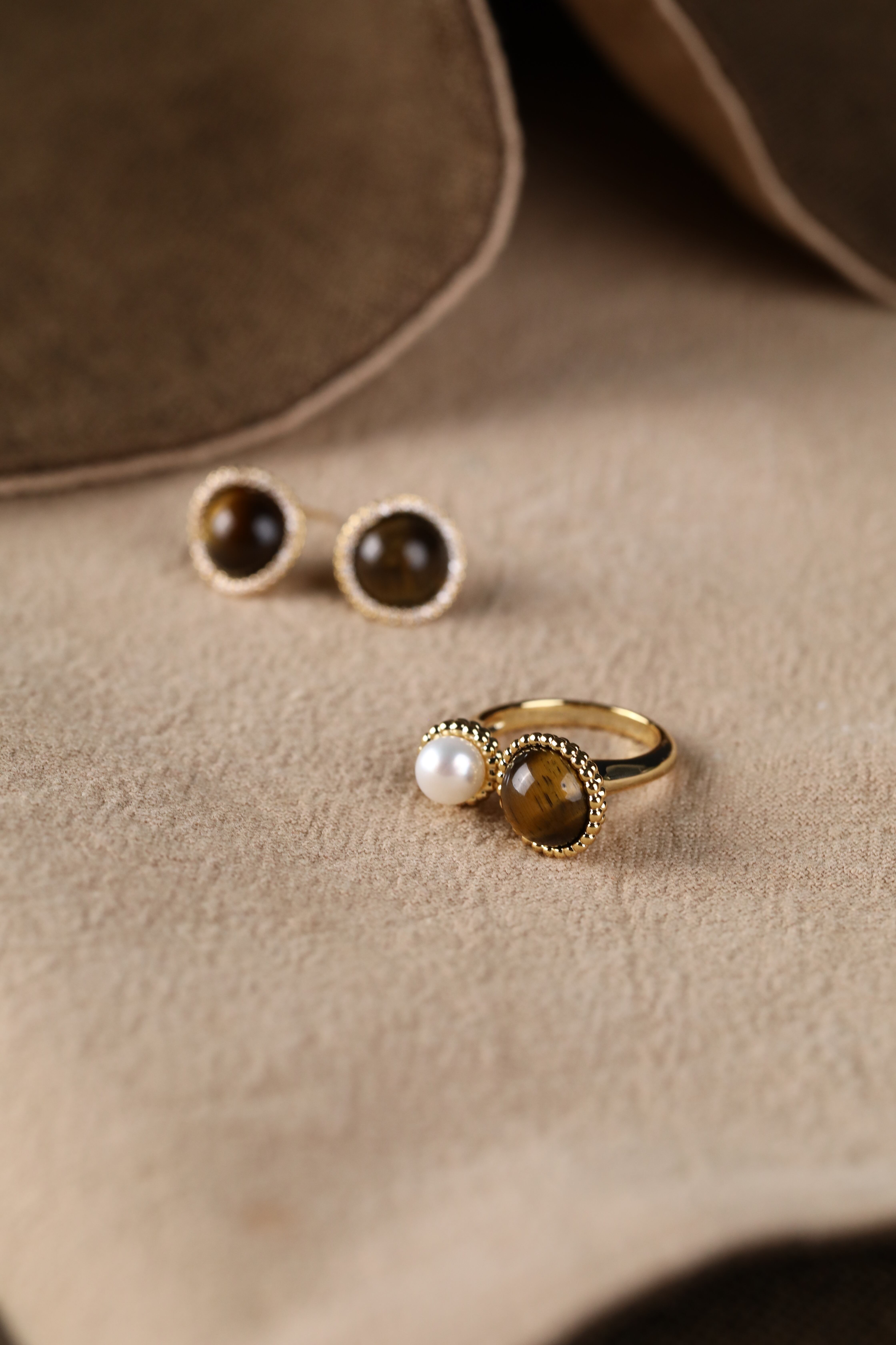 大粒のタイガーアイの力強さとパールのフェミニンな雰囲気、この二つの絶妙なバランスがとても洗練されたリングです。