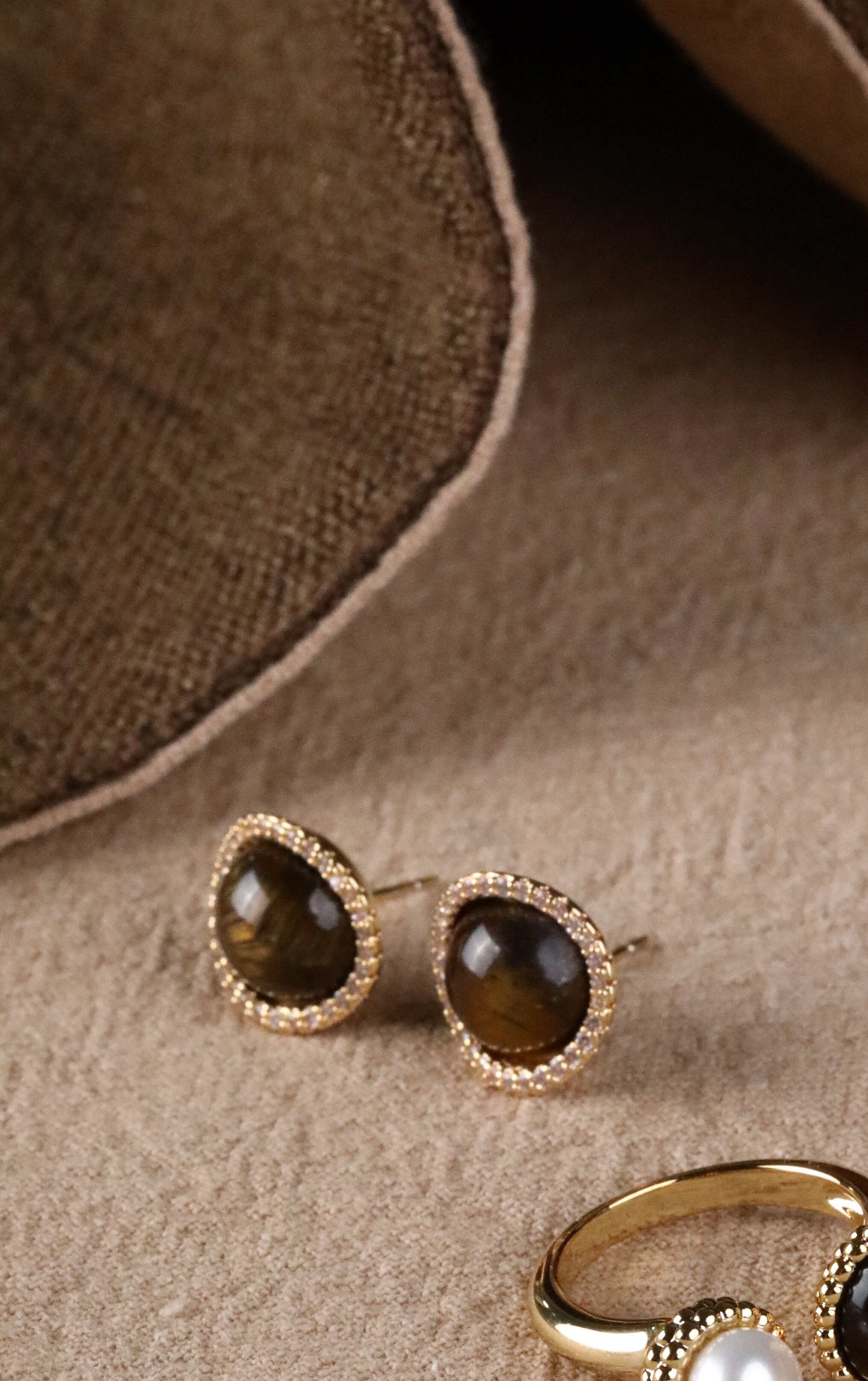 イエローからブラウンの光沢が美しいタイガーアイをキュービックジルコニアで囲むようにデザインされた上品なピアスです。