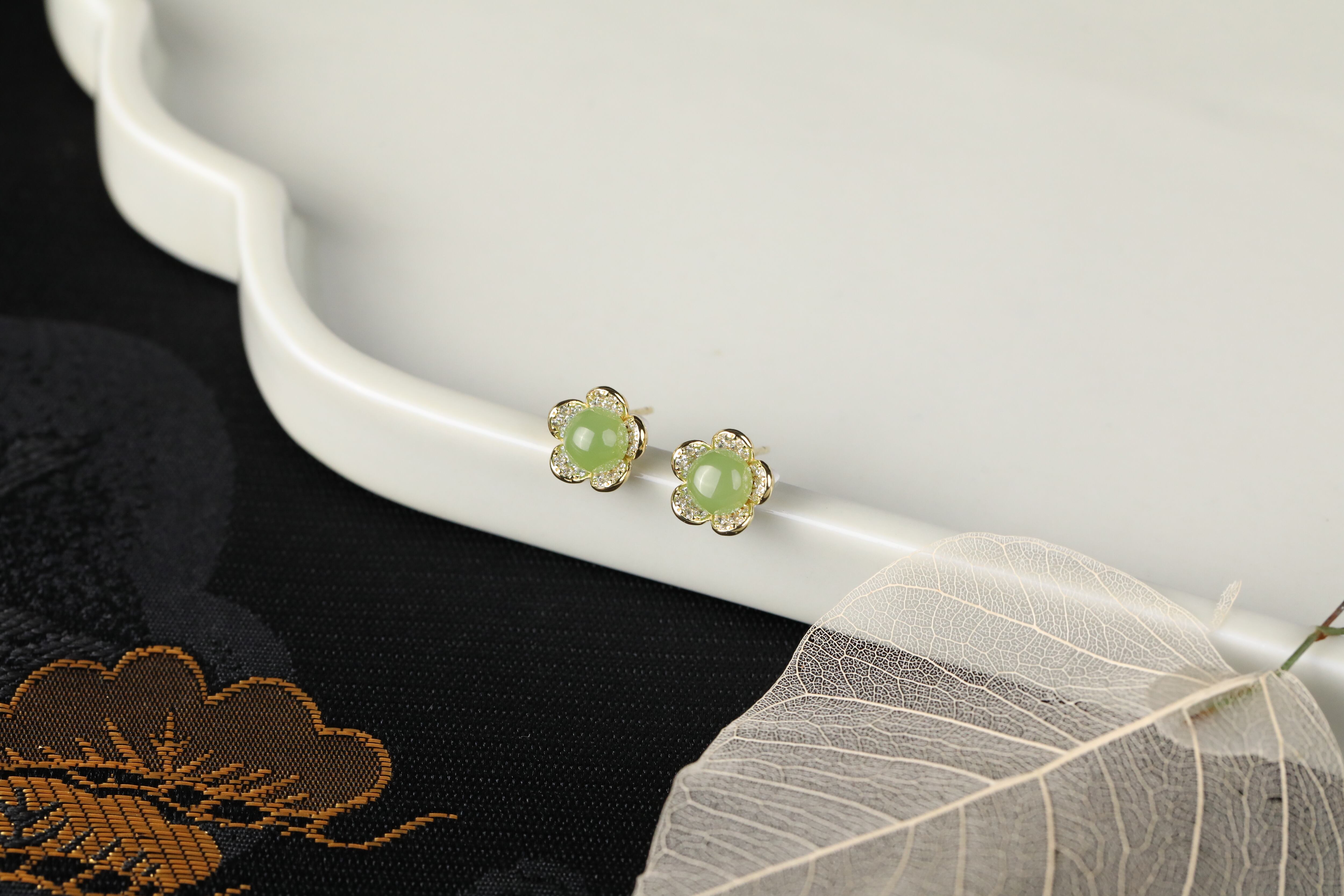 小ぶりでも存在感抜群の翡翠フラワーモチーフピアスです。ジルコニアがキラリと輝くデザインが、アクセントになっており、大人の女性にぴったりのアイテムです。