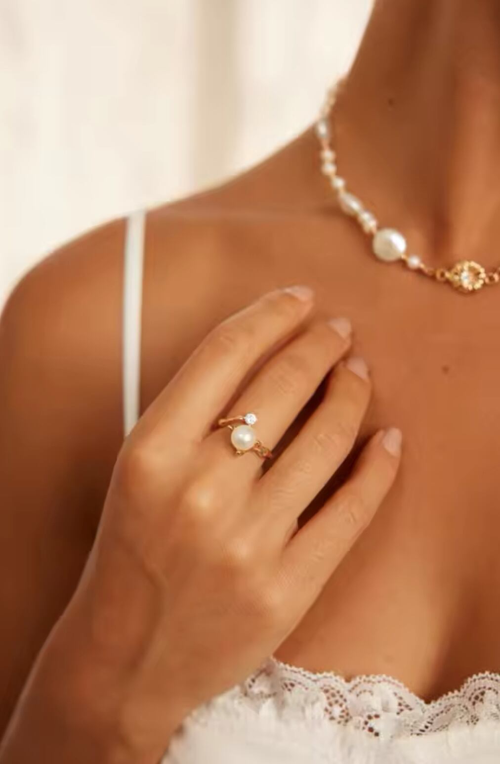 洗練されたデザインが光る、パールデザインリングです。淡水パールを使用したこの指輪は、個性的でありながらも、ビンテージゴールドのカラーが上品さを引き立てます!